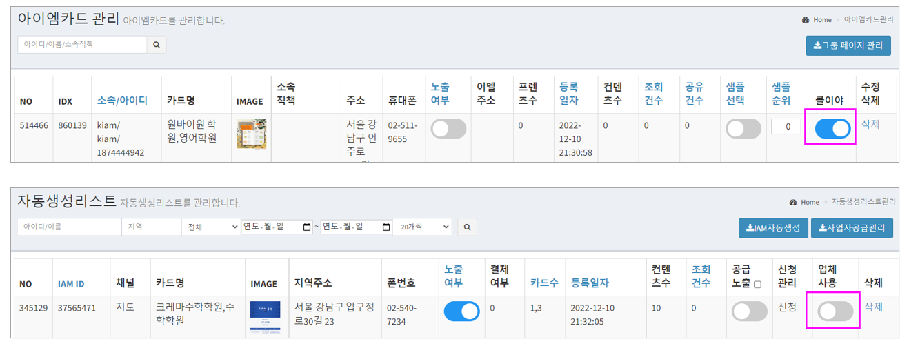 3. 업체가 2번 아이엠을 사용결정했다면 자동생성리스트 페이지에서 "업체사용" 활성화를 한다.