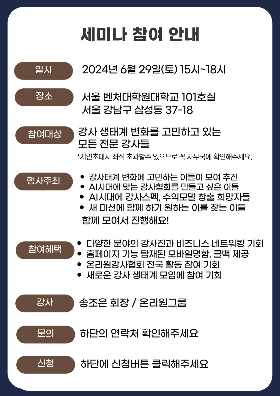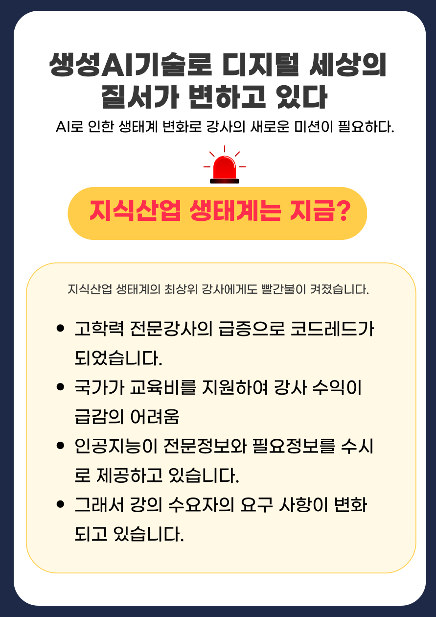 생성 AI시대에 새로운 강사 활동과 수익모델이 필요합니다. 이번세미나에서 만나보세요.